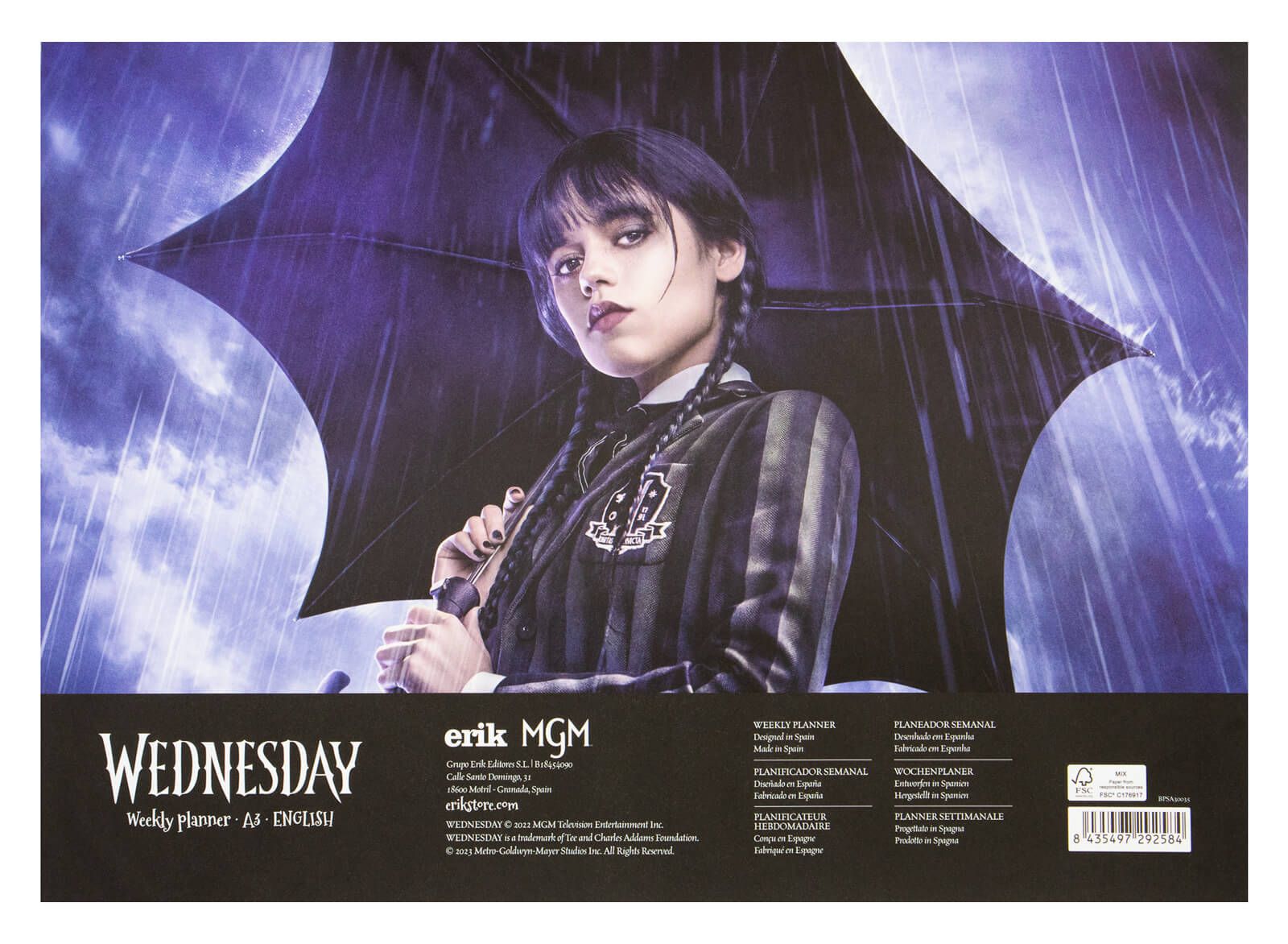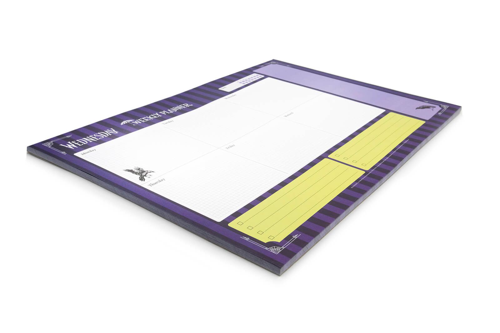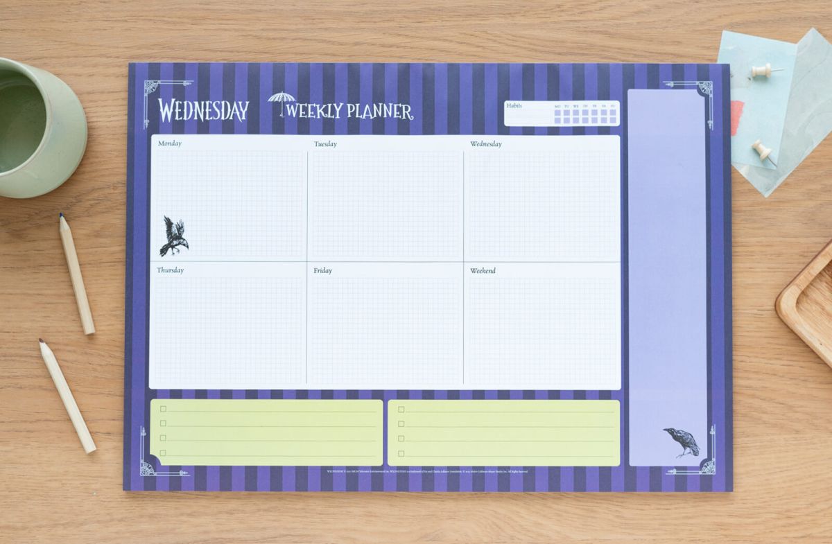 Tygodniowy planer Wednesday Planer A3 z ulubionym motywem w któym zaplanujesz cały tydzień. Planer zadrukowany jestkolorowymi grafikamizwiązanymi z głównym motywem. Ma dużo miejsca na notatki na każdy dzień tygodnia. Arkusze są przyklejone na krótkim boku (orientacja pozioma) i nie mają okładki. Tooryginalny produktposiadający licencję producenta. Szczegóły techniczne Wymiary planera:42x29,7 cm