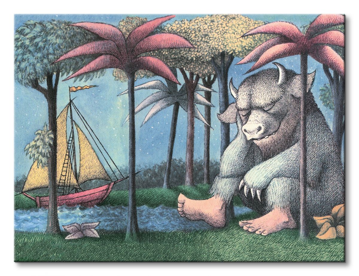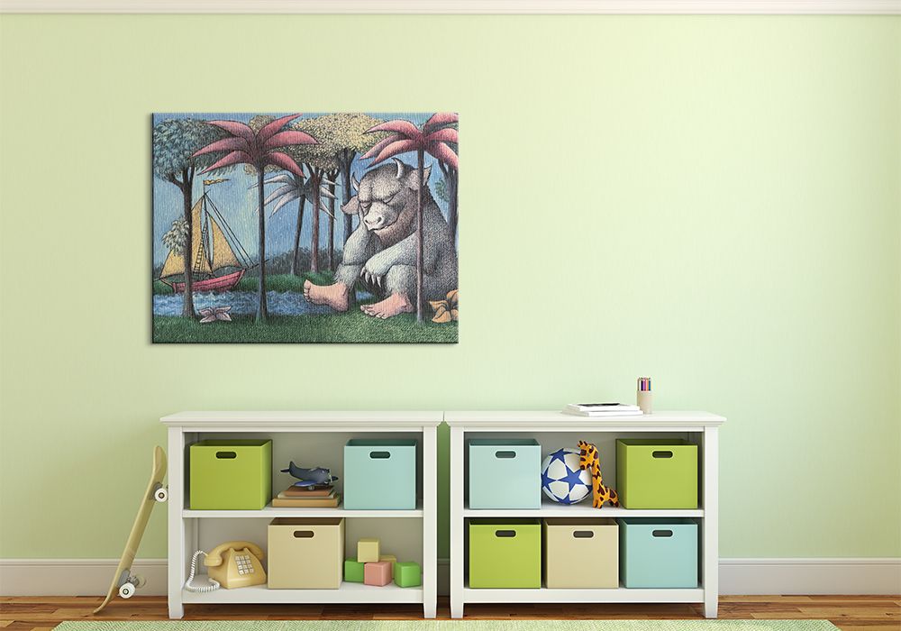 Obraz na ścianę noszący nazwę Where the Wild Things are. Autorstwa: Maurice Sendak Szukasz oryginalnego obrazu na ścianę? Wybierz jeden z naszej kolekcji! wyraziste barwy i doskonała ostrość nadruku., obrazy charakteryzuje wysokie nasycenie barw i ostrość, nie sposób oderwać od nich wzrok. Wysokie nasycenie barw i doskonała ostrość nadruku to cechy naszych obrazów. Dzięki najnowszym technologiom kolory obrazu pozostają niezmienione przez bardzo długi czas. Bawełniane płótno wysokiej jakości gwarantuje świetne odwzorowanie i trwałość obrazu.