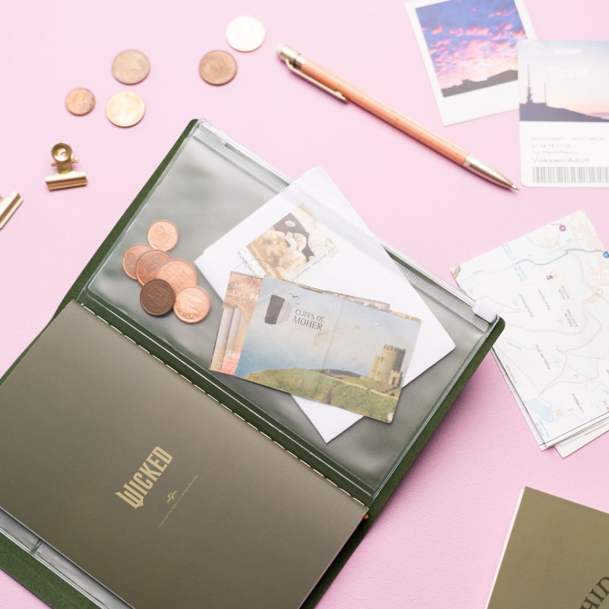 Zawiera dwie wymienne książeczki po 80 kartek każda, miejsce na karty oraz kieszeń wewnętrzną.