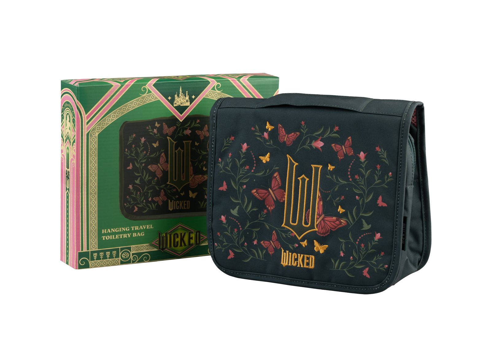 Wicked For Good - wisząca kosmetyczka podróżna Numer katalogowy: MARE0385 Producent: Erik Wymiary: po złożeniu 24x20x9 cm, po rozłożeniu 24x42x8,5 cm Wisząca kosmetyczka podróżna Wicked For Good została wykonana z wytrzymałego poliestru i ozdobiona haftowanym motywem motyli oraz roślin. Po zapięciu tworzy kompaktową torbę, którą łatwo spakować do walizki, a po rozłożeniu i zawieszeniu na haczyku zapewnia wygodny dostęp do wszystkich kosmetyków. W środku znajduje się kilka kieszeni wewnętrznych oraz trzy przegródki zapinane na zamek o różnych rozmiarach, co ułatwia organizację zarówno miniaturowych, jak i pełnowymiarowych produktów pielęgnacyjnych. Szczegóły techniczne Materiał: poliester Druk z haftem na klapie Rączka do przenoszenia w dłoni Tylnia kieszeń zewnętrzna Haczyk do zawieszania w łazience Dwie kieszenie wewnętrzne i trzy przegródki na zamek Metalowe suwaki z ozdobnymi uchwytami Oryginalny produkt na oficjalnej licencji Wicked, wyprodukowany przez Erik.