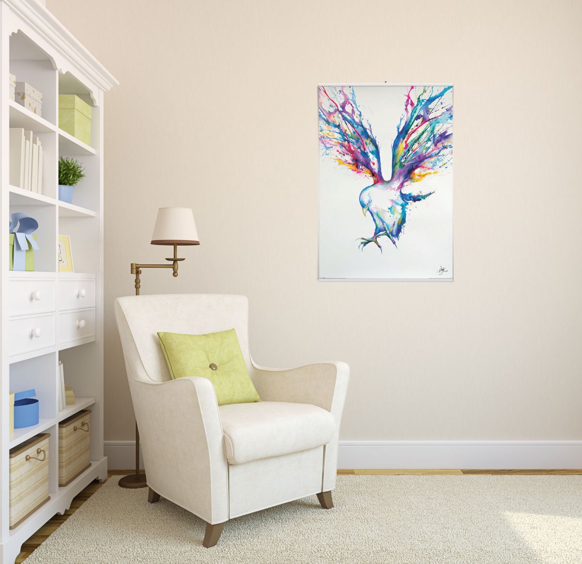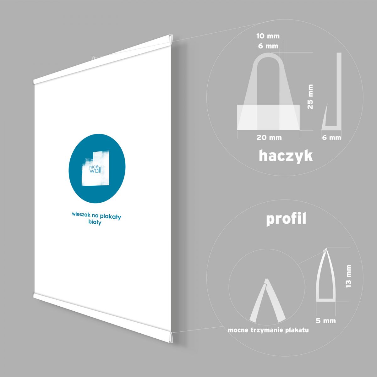 Biały wieszak na plakat to doskonały i tani sposób na powieszenie twojego plakatu na ścianie. Komplet składa się z dwóch listew wykonanych z plastiku i dwóch oczek służących do powieszenia górnej listwy na gwoździu w ścianie. Za pomocą tego wieszaka możesz umieścić na ścianie plakaty o maksymalnej szerokości 62 cm Szybki i prosty montaż wsuń listwę z oczkiem na górną krawędź plakatu a drugą na dolną krawędź, wbij gwoździk do ściany i powieś na nim plakat za pomocą oczka w górnej listwie - gotowe! Możliwość docięcia potrzebujesz krótszej listwy? wieszaki wykonane są z plastiku dlatego łatwo można je samodzielnie docinać.