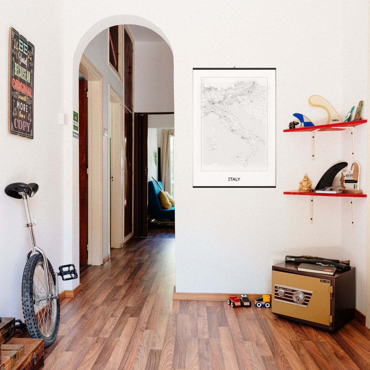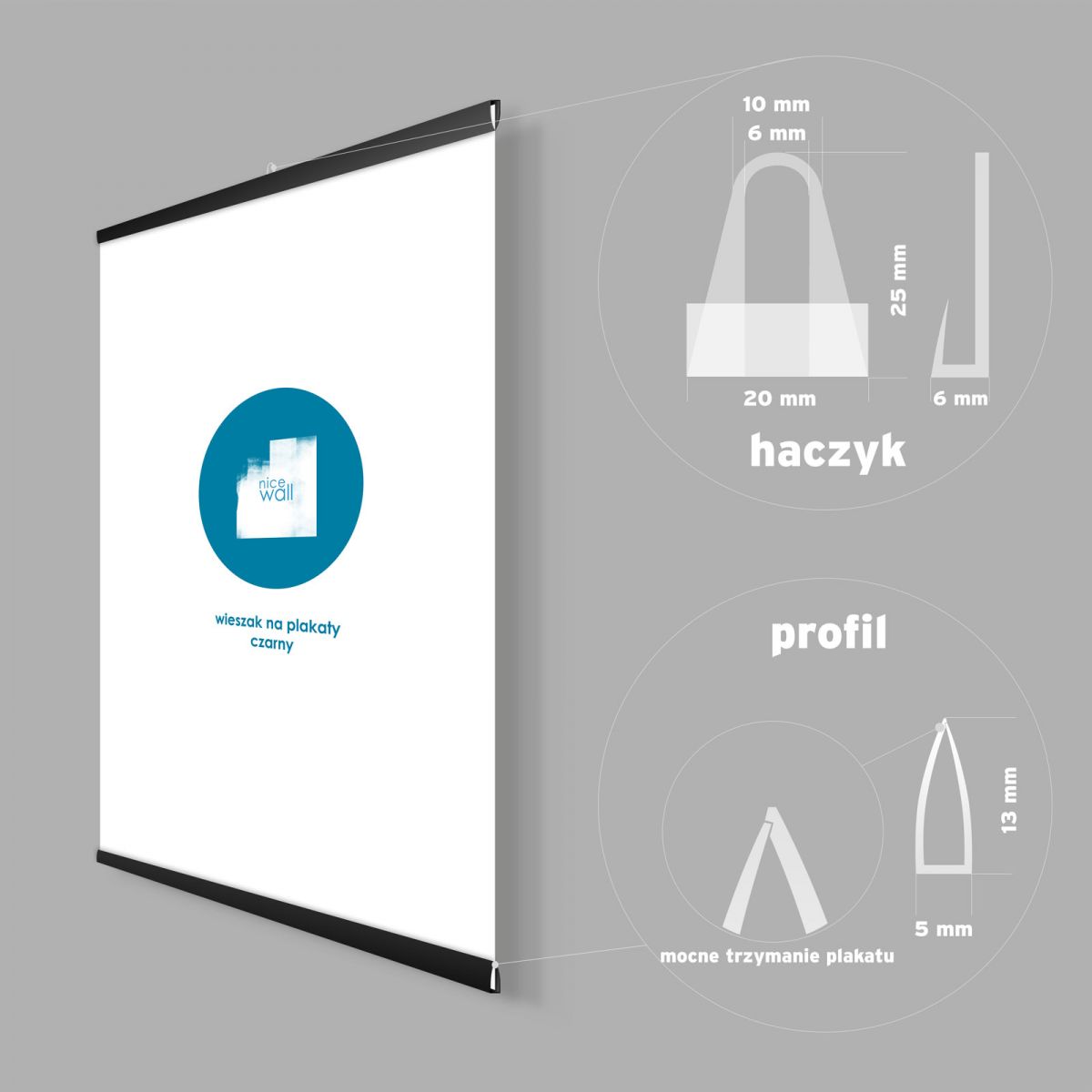 Czarny wieszak na plakat to doskonały i tani sposób na powieszenie twojego plakatu na ścianie. Komplet składa się z dwóch listew wykonanych z plastiku i oczka służącego do powieszenia górnej listwy na gwoździu w ścianie. Za pomocą tego wieszaka możesz umieścić na ścianie plakaty o maksymalnej szerokości 41 cm Szybki i prosty montaż wsuń listwę z oczkiem na górną krawędź plakatu a drugą na dolną krawędź, wbij gwoździk do ściany i powieś na nim plakat za pomocą oczka w górnej listwie - gotowe! Możliwość docięcia potrzebujesz krótszej listwy? wieszaki wykonane są z plastiku dlatego łatwo można je samodzielnie docinać.