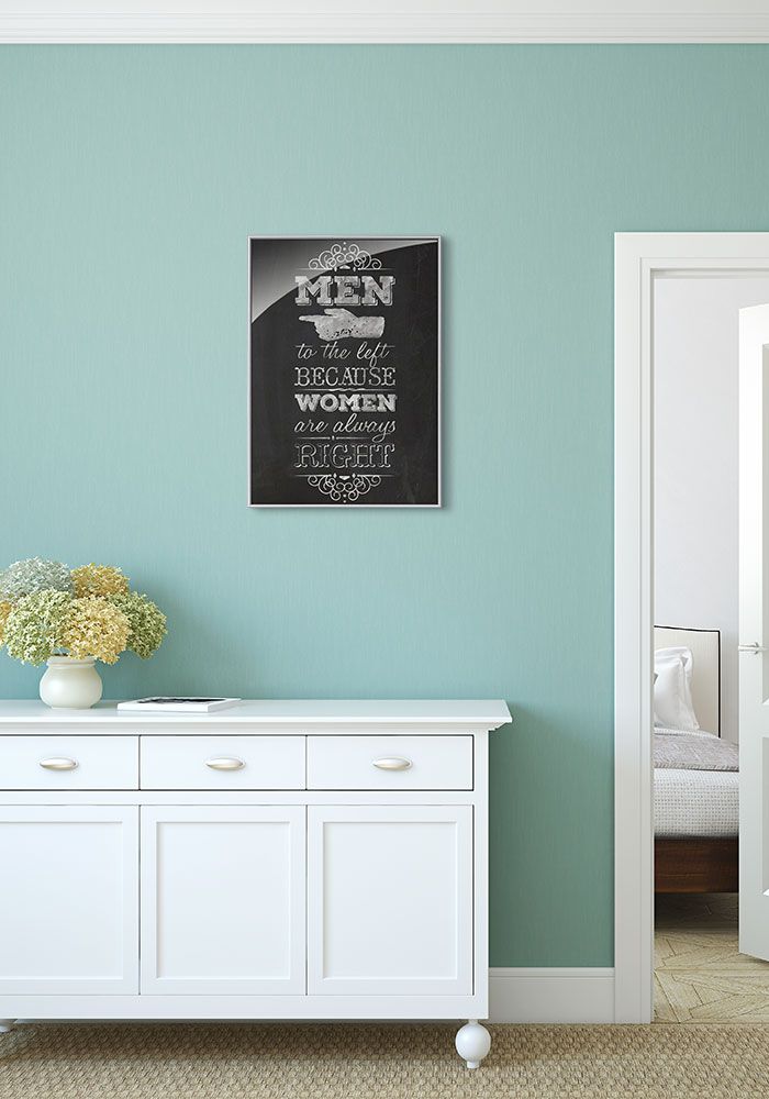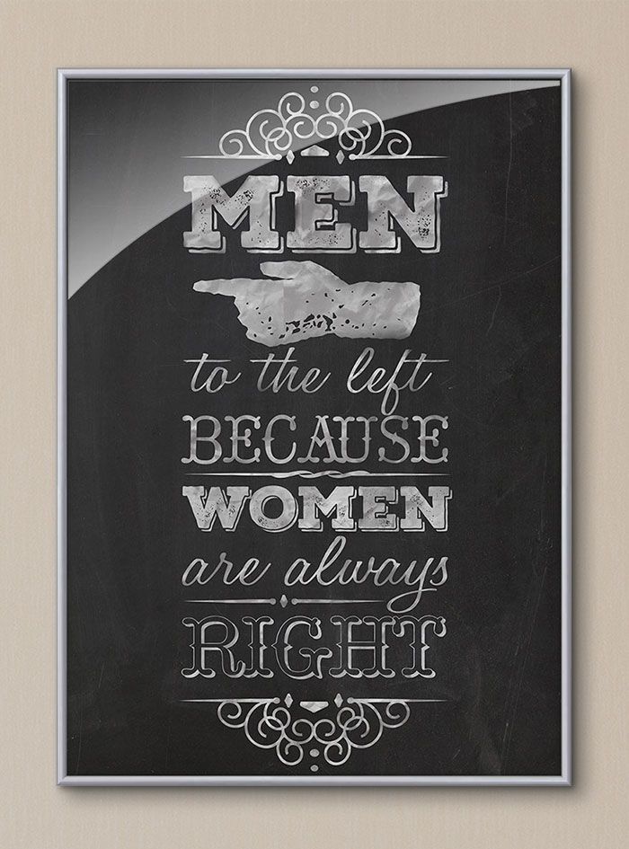 Plakat na ścianę zatytułowany Women are always right Szukasz oryginalnych, wykonanych z najwyższą starannością dekoracji? Drukujemy dla Ciebie na materiałach najlepszej jakości a nasi graficy ciągle przygotowują ciekawe, nowoczesne wzory plakatów. Plakat drukowany na grubym i mocnym papierze satynowym o gramaturze 220 g/m2 przez polskiego producenta. Dzięki temu umieszczony w ramie nie marszczy się i świetnie prezentuje przez długi czas. Powierzchnia plakatu jest matowa, zadrukowana w technologii druku cyfrowego co pozwoliło uzyskać głębokie nasycenie kolorów i niesamowitą ostrość obrazu. Wybierając ten produkt masz pewność, że otrzymasz fantastyczną jakość. Wszystkie plakaty z naszej oferty posiadają licencję, otrzymasz więc oryginalny produkt.