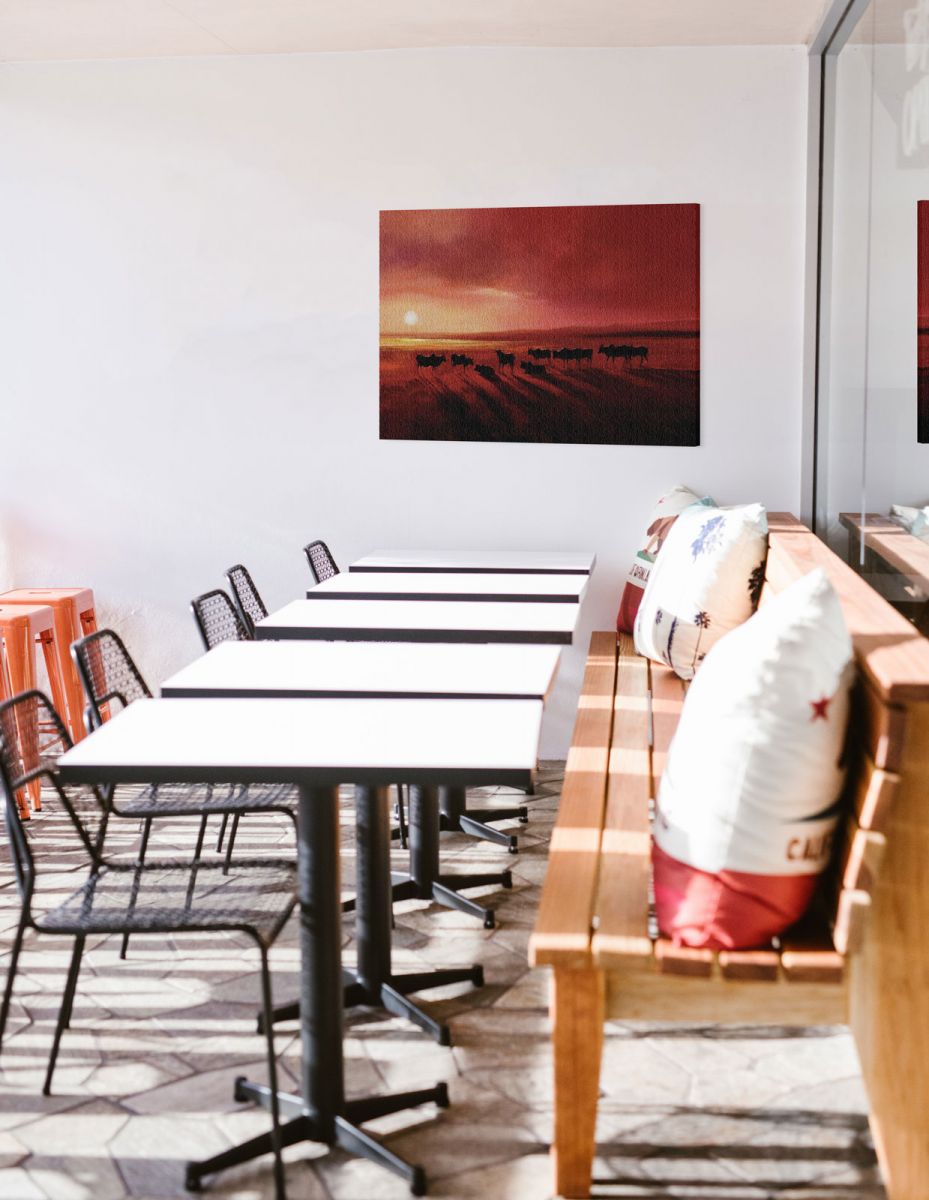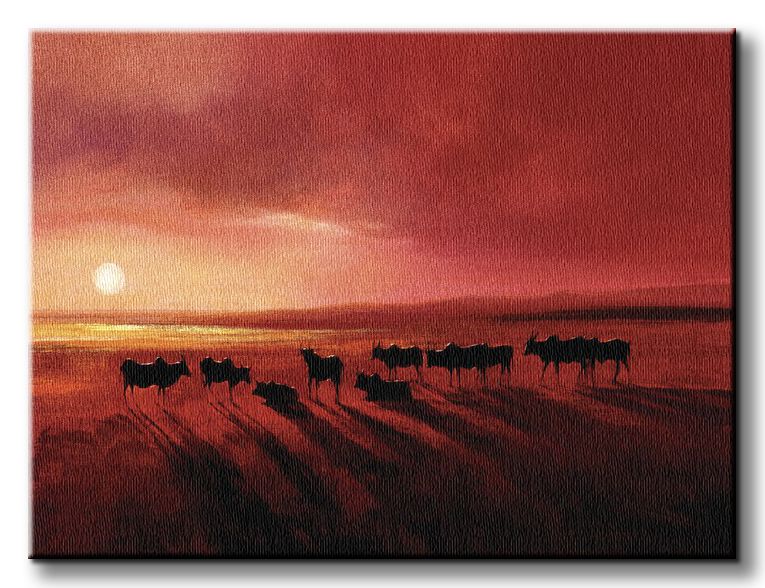 Obraz na ścianę noszący nazwę Zebu At Dusk. Autorstwa: Sanders, Jonathan Szukasz oryginalnej, ekskluzywnej dekoracji na ścianę? Ten obraz jest dla Ciebie! fantastyczne kolory i rewelacyjna ostrość., obrazy charakteryzuje wysokie nasycenie barw i ostrość, nie sposób oderwać od nich wzrok. Kolory utrzymują się przez długie lata. Mocne bawełniane płótno wygląda naturalnie i oddaje charakter autentyczności obrazu.