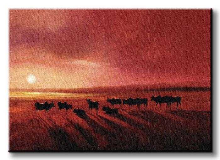 Obraz na ścianę noszący nazwę Zebu At Dusk. Autorstwa: Sanders, Jonathan Szukasz oryginalnej, ekskluzywnej dekoracji na ścianę? Ten obraz jest dla Ciebie! doskonała jakość barw i jakość wykonania., obrazy charakteryzuje wysokie nasycenie barw i ostrość, nie sposób oderwać od nich wzrok. Kolory utrzymują się przez długie lata. Doskonałej jakości płótno to gwarancja naturalnego wyglądu i trwałości obrazu.